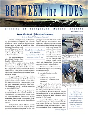 In this issue of Between the Tides: Interviews with last year's Bob Breen scholarship award recipients; a year-end review by Friends of Fitzgerald Marine Reserve Board President Kathleen Hayes; and a fascinating article by Karen Kalumuck on how local marine life such as sea urchins and colonial tunicates are used in medical research. The cover article tells the story of Morris, a Northern Gannett who has been a unique visitor to the West Coast since 2012. Morris, who is frequently spotted at Pillar Point, is a long way from Northern Gannett's usual home on the East Coast.