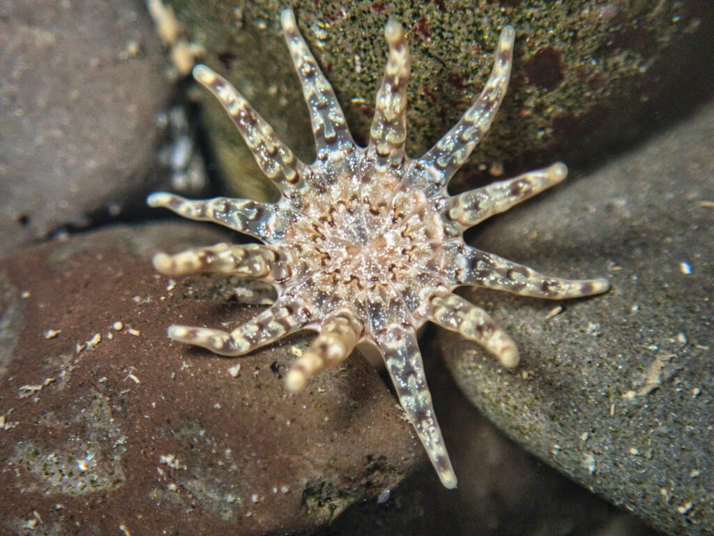 Unseen by many visitors, two species of the burrowing anemone Halcampa can be found in the FMR intertidal channels. Both H. crypta (12 tentacles) and H. decemtentaculata (10 tentacles) are small (1-2 cm in diameter). Student researcher Jacqueline Rajerison noted that both can be found burrowing in gravelly areas into sandy bottom, as well as at the base of eelgrass and algae holdfasts. (See Jacqueline’s December 2022 BTT article for much more information on these cryptic anemones!).