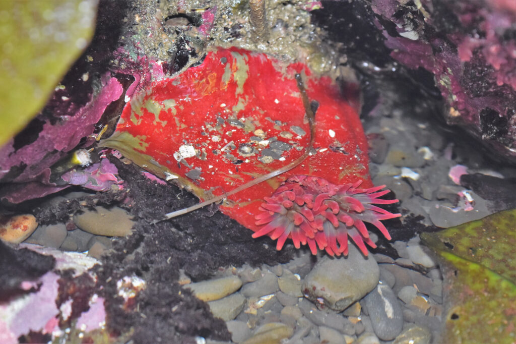 Known by several common names, including Christmas Anemone, Mottled Anemone, and Painted Anemone displays red and green areas on its column and uses its nematocysts to capture and eat crabs, mussels, fish, and other tidepool animals. They are common inhabitants of low intertidal to subtidal zones, from Alaska through California, and can grow quite large – up to eight inches in diameter and twelve inches tall. They are noted to live up to 60-80 years. We do find them at FMR, so be sure to look for them during the upcoming king tides in December and January.